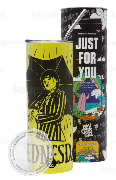 Wednesday Addams, Neon Yellow Travel Tumbler θερμό, μεταλλικό καλαμάκι(Ανωξείδωτο 304 Food grade, BPA free, 600ml)