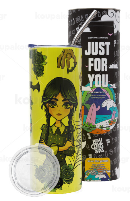 Wednesday and Enid Sinclair, Neon Yellow Travel Tumbler θερμό, μεταλλικό καλαμάκι(Ανωξείδωτο 304 Food grade, BPA free, 600ml)