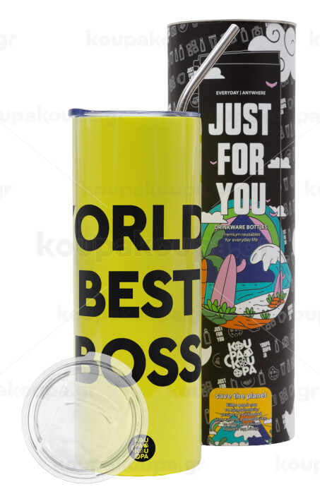 World's best boss, Neon Yellow Travel Tumbler θερμό, μεταλλικό καλαμάκι(Ανωξείδωτο 304 Food grade, BPA free, 600ml)