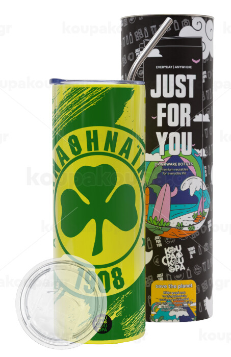 Π.Α.Ο., Neon Yellow Travel Tumbler θερμό, μεταλλικό καλαμάκι(Ανωξείδωτο 304 Food grade, BPA free, 600ml)