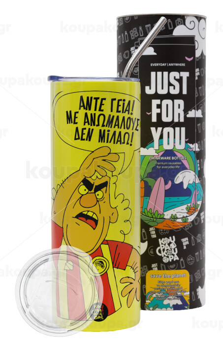 Τάκης, Άντε γεια, με ανώμαλους δεν μιλάω!, Neon Yellow Travel Tumbler θερμό, μεταλλικό καλαμάκι(Ανωξείδωτο 304 Food grade, BPA free, 600ml)
