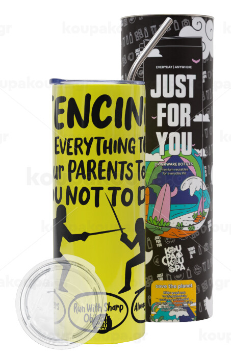 Fencing, do everything that your parents told you not to do., Neon Yellow Travel Tumbler θερμό, μεταλλικό καλαμάκι(Ανωξείδωτο 304 Food grade, BPA free, 600ml)