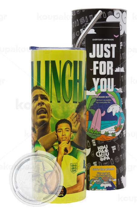 Jude Bellingham, Neon Yellow Travel Tumbler θερμό, μεταλλικό καλαμάκι(Ανωξείδωτο 304 Food grade, BPA free, 600ml)