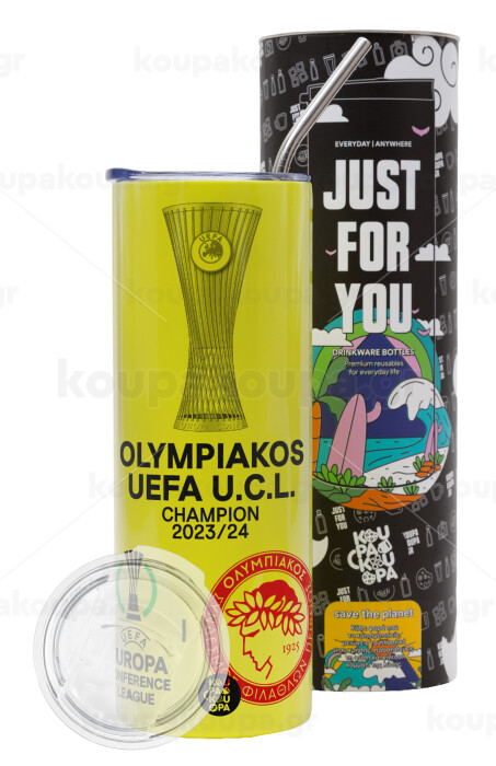 Ολυμπιακός νικητής UEFA Europa Conference League Champion 2023/24, Neon Yellow Travel Tumbler θερμό, μεταλλικό καλαμάκι(Ανωξείδωτο 304 Food grade, BPA free, 600ml)