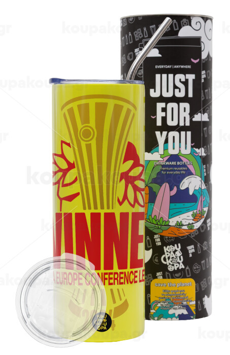 Europa Conference League WINNER, Neon Yellow Travel Tumbler θερμό, μεταλλικό καλαμάκι(Ανωξείδωτο 304 Food grade, BPA free, 600ml)