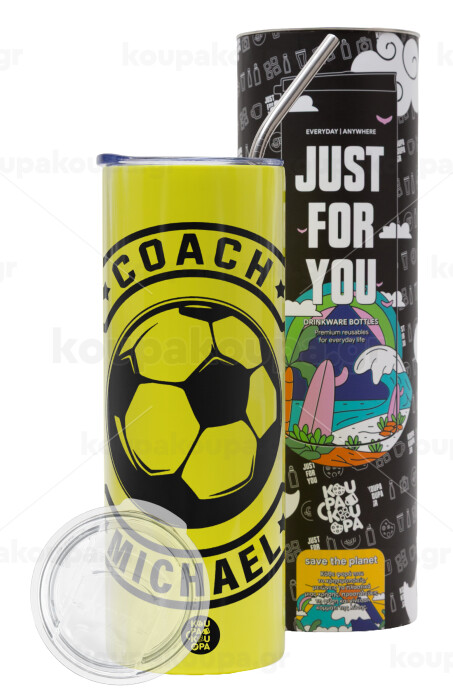 Soccer coach, Neon Yellow Travel Tumbler θερμό, μεταλλικό καλαμάκι(Ανωξείδωτο 304 Food grade, BPA free, 600ml)