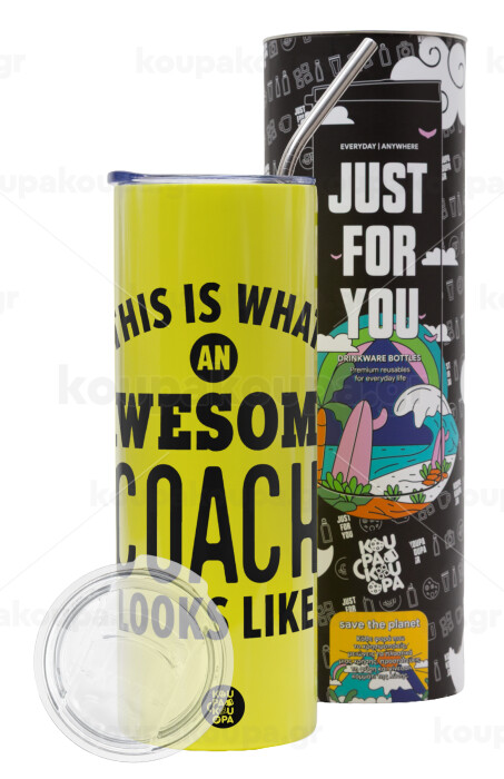 This is what an awesome COACH looks like!, Neon Yellow Travel Tumbler θερμό, μεταλλικό καλαμάκι(Ανωξείδωτο 304 Food grade, BPA free, 600ml)