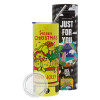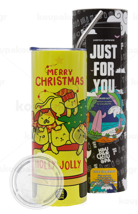 Merry Christmas cats in car, Neon Yellow Travel Tumbler θερμό, μεταλλικό καλαμάκι(Ανωξείδωτο 304 Food grade, BPA free, 600ml)