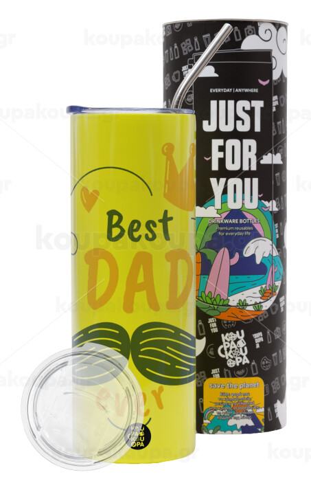 Best dad ever ο Βασιλιάς, Neon Yellow Travel Tumbler θερμό, μεταλλικό καλαμάκι(Ανωξείδωτο 304 Food grade, BPA free, 600ml)