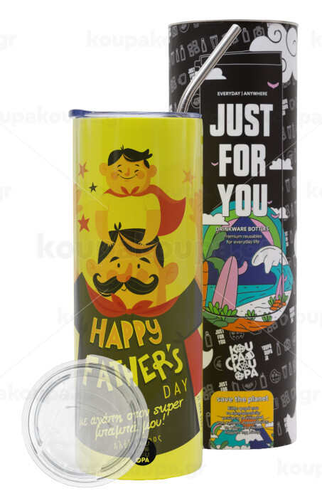 Happy Fathers Day με όνομα, Neon Yellow Travel Tumbler θερμό, μεταλλικό καλαμάκι(Ανωξείδωτο 304 Food grade, BPA free, 600ml)