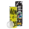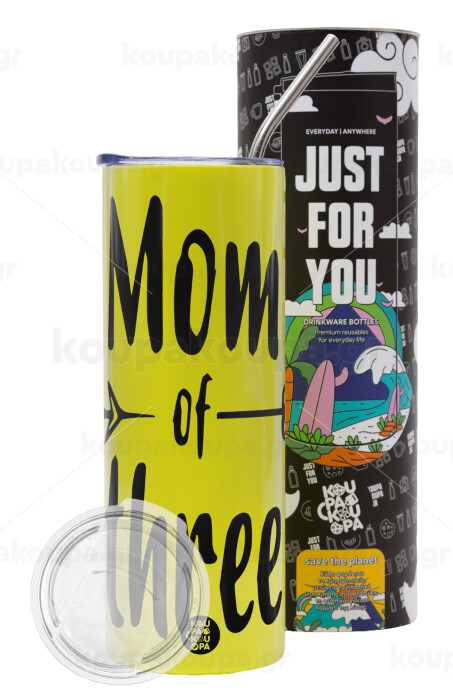 Mom of three, Neon Yellow Travel Tumbler θερμό, μεταλλικό καλαμάκι(Ανωξείδωτο 304 Food grade, BPA free, 600ml)