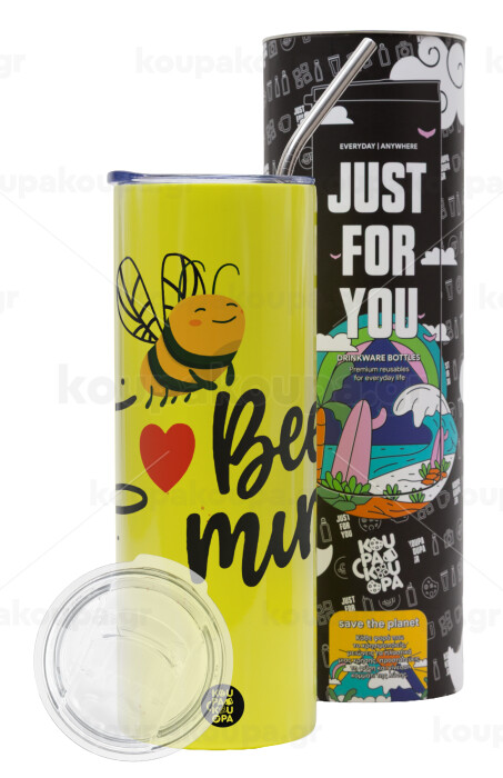 Bee mine!!!, Neon Yellow Travel Tumbler θερμό, μεταλλικό καλαμάκι(Ανωξείδωτο 304 Food grade, BPA free, 600ml)