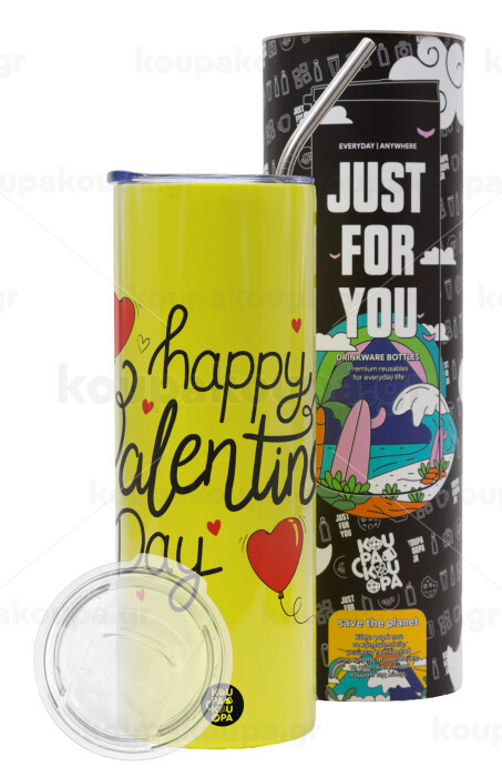 Happy Valentines Day!!!, Neon Yellow Travel Tumbler θερμό, μεταλλικό καλαμάκι(Ανωξείδωτο 304 Food grade, BPA free, 600ml)