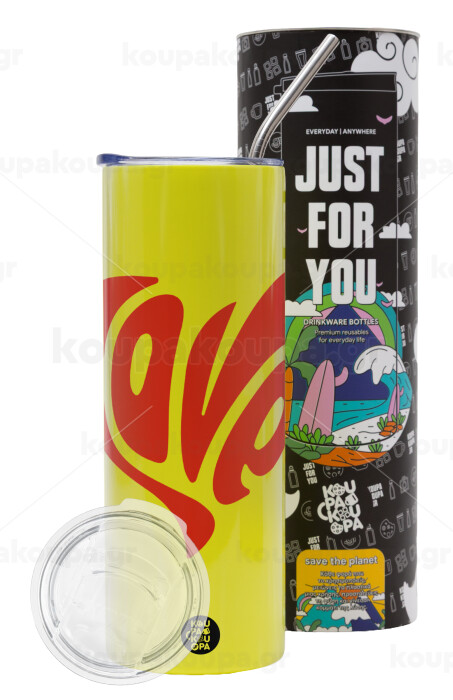 Love, Neon Yellow Travel Tumbler θερμό, μεταλλικό καλαμάκι(Ανωξείδωτο 304 Food grade, BPA free, 600ml)