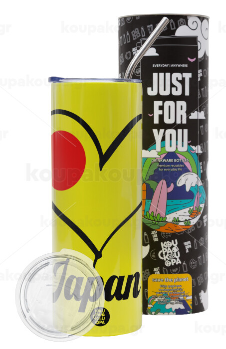 Japan flag, Neon Yellow Travel Tumbler θερμό, μεταλλικό καλαμάκι(Ανωξείδωτο 304 Food grade, BPA free, 600ml)
