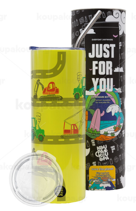 Αμαξάκια στον δρόμο, Neon Yellow Travel Tumbler θερμό, μεταλλικό καλαμάκι(Ανωξείδωτο 304 Food grade, BPA free, 600ml)