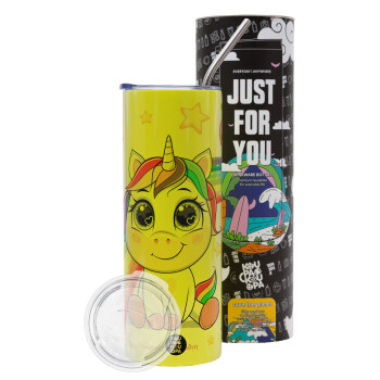 Unicorn baby με όνομα, Neon Yellow Travel Tumbler θερμό, μεταλλικό καλαμάκι(Ανωξείδωτο 304 Food grade, BPA free, 600ml)
