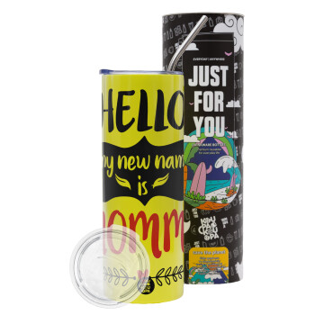 Hello, my new name is Mommy, Neon Yellow Travel Tumbler θερμό, μεταλλικό καλαμάκι(Ανωξείδωτο 304 Food grade, BPA free, 600ml)