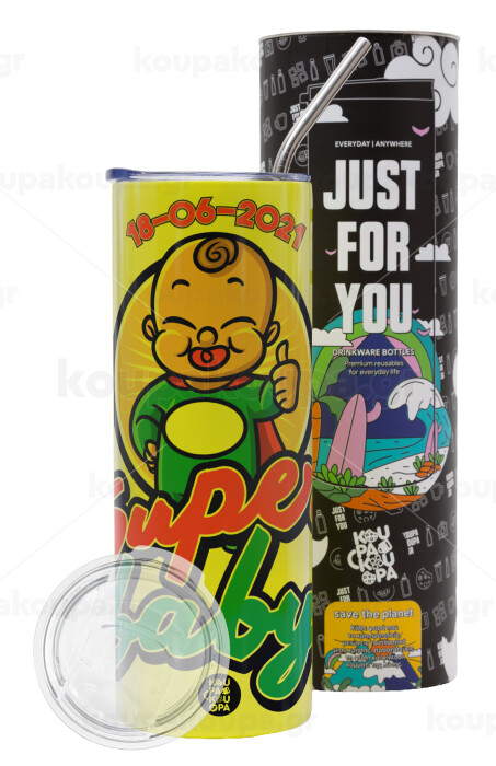 Super baby., Neon Yellow Travel Tumbler θερμό, μεταλλικό καλαμάκι(Ανωξείδωτο 304 Food grade, BPA free, 600ml)