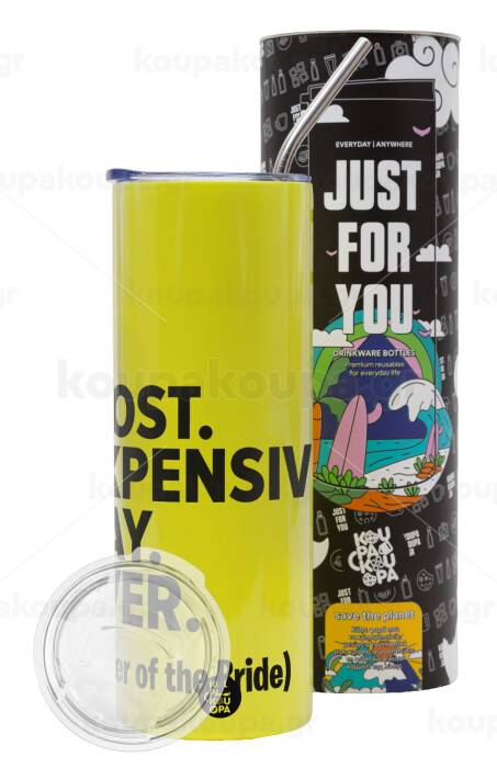 Most expensive day ever, Neon Yellow Travel Tumbler θερμό, μεταλλικό καλαμάκι(Ανωξείδωτο 304 Food grade, BPA free, 600ml)
