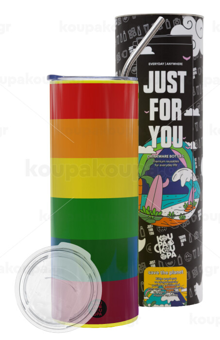 Rainbow flag (LGBT) , Neon Yellow Travel Tumbler θερμό, μεταλλικό καλαμάκι(Ανωξείδωτο 304 Food grade, BPA free, 600ml)