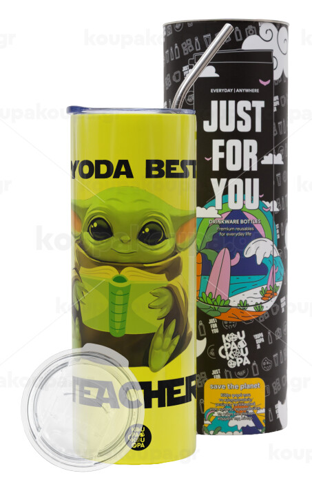 Yoda Best Teacher, Neon Yellow Travel Tumbler θερμό, μεταλλικό καλαμάκι(Ανωξείδωτο 304 Food grade, BPA free, 600ml)