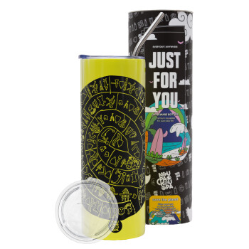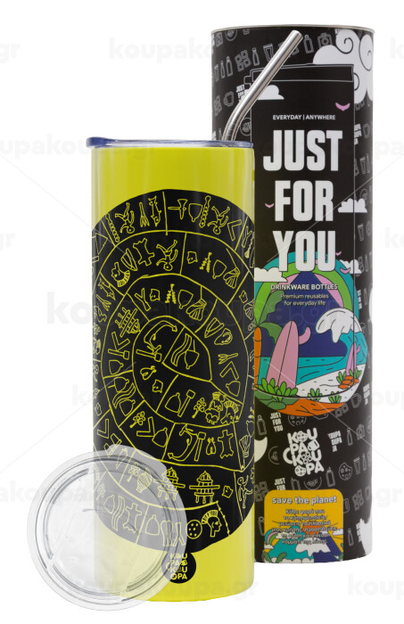 Δίσκος Φαιστού, Neon Yellow Travel Tumbler θερμό, μεταλλικό καλαμάκι(Ανωξείδωτο 304 Food grade, BPA free, 600ml)
