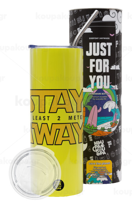 Stay Away, Neon Yellow Travel Tumbler θερμό, μεταλλικό καλαμάκι(Ανωξείδωτο 304 Food grade, BPA free, 600ml)