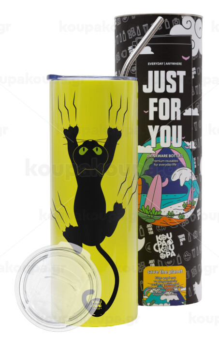 Γατούλα γρατζουνιά, Neon Yellow Travel Tumbler θερμό, μεταλλικό καλαμάκι(Ανωξείδωτο 304 Food grade, BPA free, 600ml)