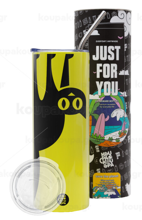 Cat upside down, Neon Yellow Travel Tumbler θερμό, μεταλλικό καλαμάκι(Ανωξείδωτο 304 Food grade, BPA free, 600ml)