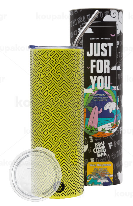 Doodle Maze, Neon Yellow Travel Tumbler θερμό, μεταλλικό καλαμάκι(Ανωξείδωτο 304 Food grade, BPA free, 600ml)