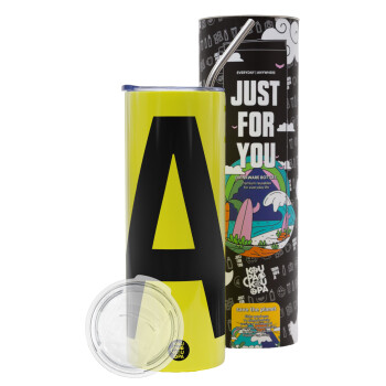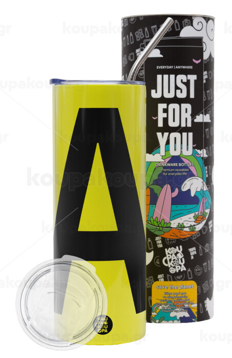 Μονόγραμμα , Neon Yellow Travel Tumbler θερμό, μεταλλικό καλαμάκι(Ανωξείδωτο 304 Food grade, BPA free, 600ml)