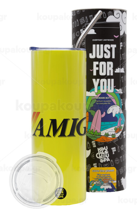 amiga, Neon Yellow Travel Tumbler θερμό, μεταλλικό καλαμάκι(Ανωξείδωτο 304 Food grade, BPA free, 600ml)