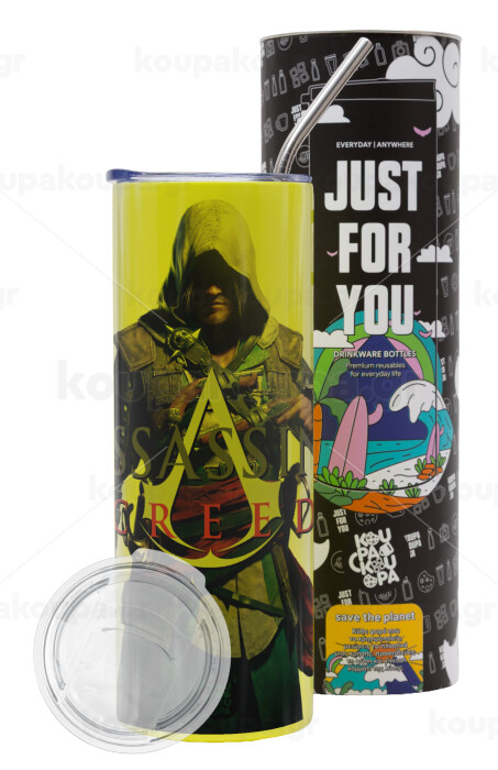 Assassin's Creed, Neon Yellow Travel Tumbler θερμό, μεταλλικό καλαμάκι(Ανωξείδωτο 304 Food grade, BPA free, 600ml)