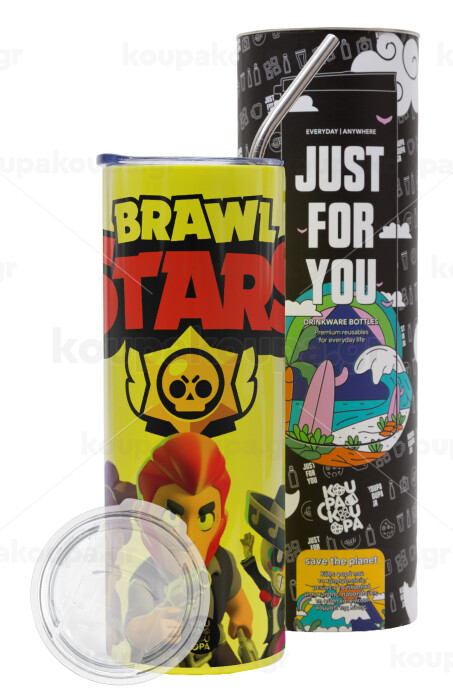 Brawl Stars Blue, Neon Yellow Travel Tumbler θερμό, μεταλλικό καλαμάκι(Ανωξείδωτο 304 Food grade, BPA free, 600ml)
