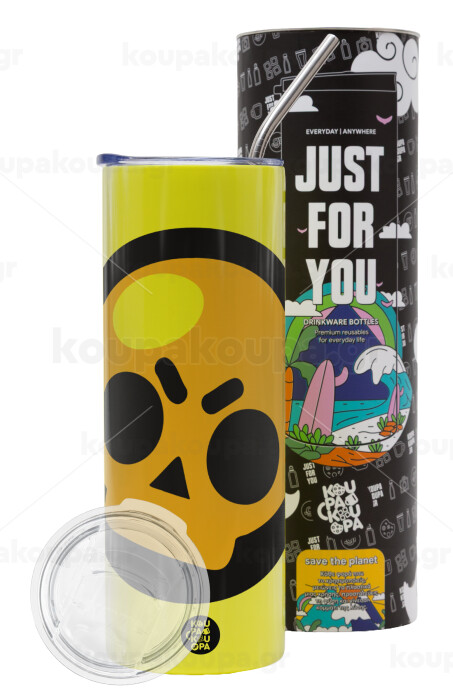 Brawl Stars Skull, Neon Yellow Travel Tumbler θερμό, μεταλλικό καλαμάκι(Ανωξείδωτο 304 Food grade, BPA free, 600ml)