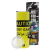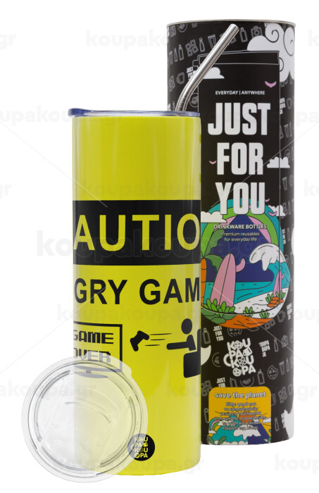 Caution, angry gamer!, Neon Yellow Travel Tumbler θερμό, μεταλλικό καλαμάκι(Ανωξείδωτο 304 Food grade, BPA free, 600ml)