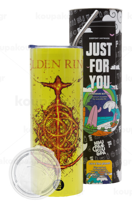 Elden Ring, Neon Yellow Travel Tumbler θερμό, μεταλλικό καλαμάκι(Ανωξείδωτο 304 Food grade, BPA free, 600ml)