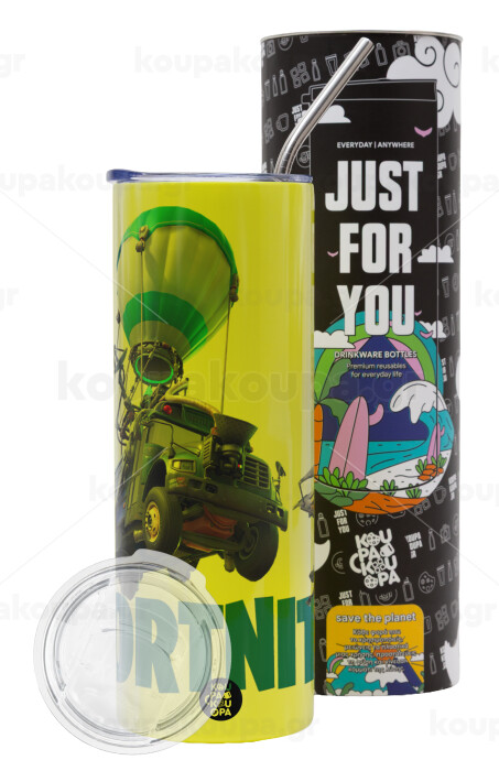 Fortnite Bus, Neon Yellow Travel Tumbler θερμό, μεταλλικό καλαμάκι(Ανωξείδωτο 304 Food grade, BPA free, 600ml)