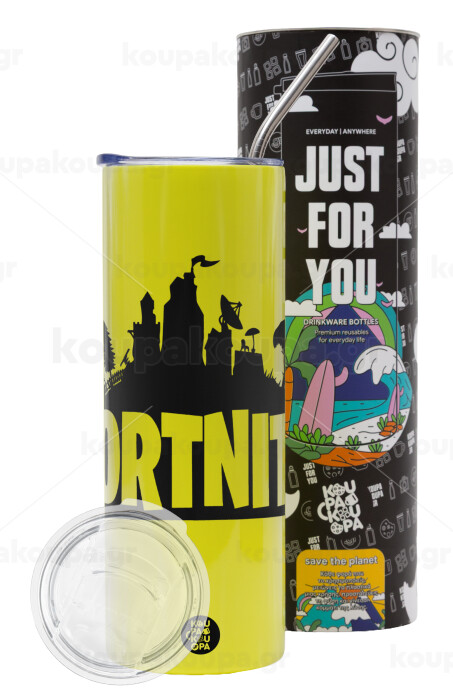Fortnite, Neon Yellow Travel Tumbler θερμό, μεταλλικό καλαμάκι(Ανωξείδωτο 304 Food grade, BPA free, 600ml)