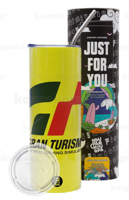 gran turismo, Neon Yellow Travel Tumbler θερμό, μεταλλικό καλαμάκι(Ανωξείδωτο 304 Food grade, BPA free, 600ml)