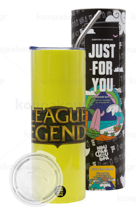 League of Legends LoL, Neon Yellow Travel Tumbler θερμό, μεταλλικό καλαμάκι(Ανωξείδωτο 304 Food grade, BPA free, 600ml)