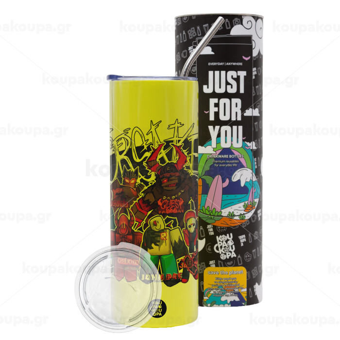 Roblox Forsaken, Neon Yellow Travel Tumbler θερμό, μεταλλικό καλαμάκι(Ανωξείδωτο 304 Food grade, BPA free, 600ml)