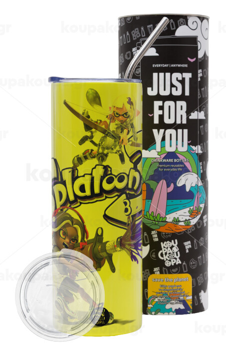 Splatoon 3, Neon Yellow Travel Tumbler θερμό, μεταλλικό καλαμάκι(Ανωξείδωτο 304 Food grade, BPA free, 600ml)