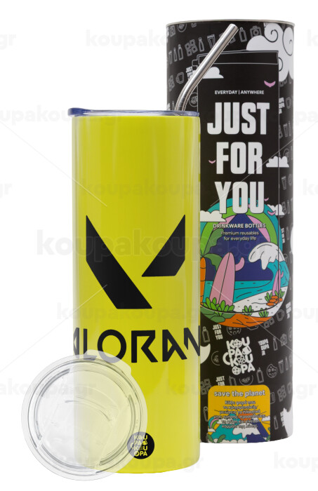 Valorant, Neon Yellow Travel Tumbler θερμό, μεταλλικό καλαμάκι(Ανωξείδωτο 304 Food grade, BPA free, 600ml)