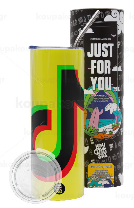 tik tok, Neon Yellow Travel Tumbler θερμό, μεταλλικό καλαμάκι(Ανωξείδωτο 304 Food grade, BPA free, 600ml)