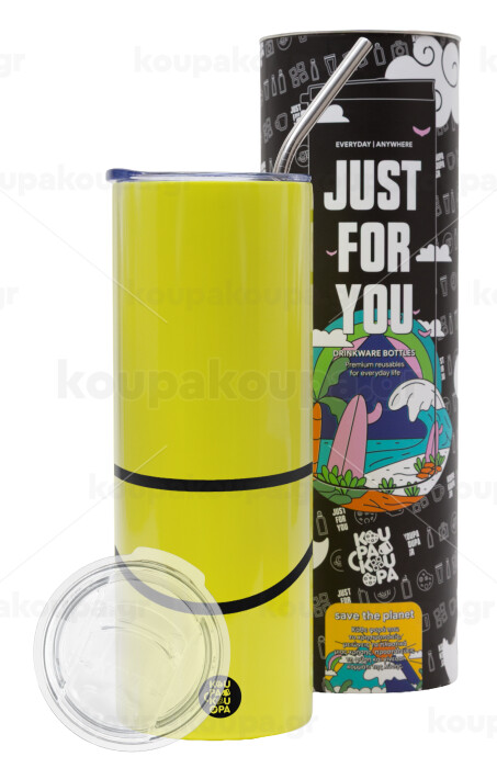 Χαμογέλα, Neon Yellow Travel Tumbler θερμό, μεταλλικό καλαμάκι(Ανωξείδωτο 304 Food grade, BPA free, 600ml)