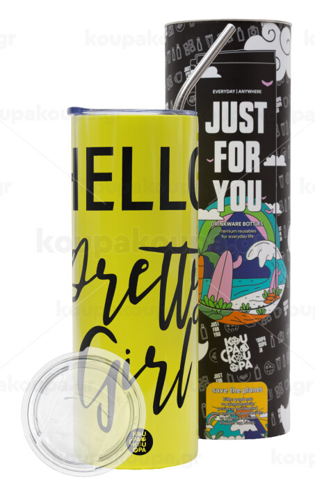 Hello pretty girl, Neon Yellow Travel Tumbler θερμό, μεταλλικό καλαμάκι(Ανωξείδωτο 304 Food grade, BPA free, 600ml)