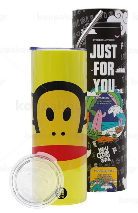 Monkey, Neon Yellow Travel Tumbler θερμό, μεταλλικό καλαμάκι(Ανωξείδωτο 304 Food grade, BPA free, 600ml)