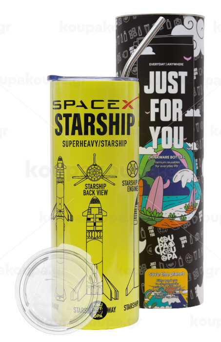 Space X, Neon Yellow Travel Tumbler θερμό, μεταλλικό καλαμάκι(Ανωξείδωτο 304 Food grade, BPA free, 600ml)